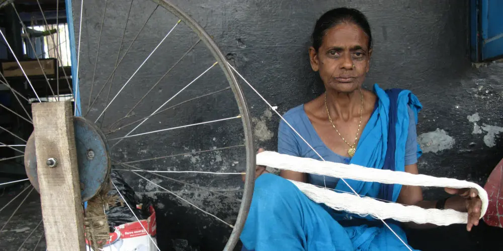 Dukhani is part of the workforce at the Little Flower Khadi Village Leprosy Rehabilitation Center in India that spins silk, dyes the yarn and weaves it into scarves for export. She is also on the management committee of the unit representing the original members of the colony aff...