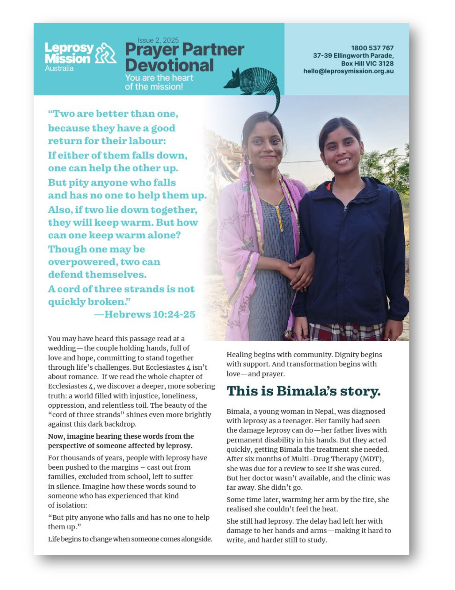 You are invited to pray alongside many others around Australia. Your ongoing prayers are needed to help make leprosy a thing of the past. Each month you can learn how you make a difference through a devotional style newsletter, focusing on how God impacts the lives of people affected by leprosy. Each day you can pray for specific needs, bringing dignity and a brighter future to many. Thank you for being a beacon of hope and love.